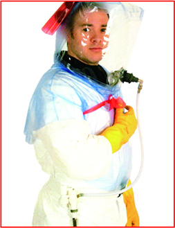 通风头罩 订货号:0709001 Respirex通风头罩的设计可用于微粒污染严重的环境中。一个外部压缩起源提供可供呼吸的空气。头罩内流通的空气,其质量必须 :1999。所有的Respirex通风头罩都标有 270:1995的 头罩内含一个空气扩散系统,向使用者提供可供呼吸的空气,该系统与独立的、可重复使用的腰带配合使用,并装有一个强制性音频报警设备。如果空气流量低于每分钟 360°可旋转供气装置,腰带可调节 颈部材料为密封的氯丁橡胶 4个带有红色盖子的PVC呼气阀 腋下系带,增加舒适感 垂直、水平方向视野宽大的清晰面屏 清晰的放射性剂量器窗口 总泄露率 270要求 上一篇文章: V-TOP型安全帽 下一篇文章: 通风一件式防护服